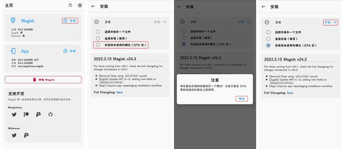 用的槽位(OTA后),弹出警告,直接点击确定。此时程序会自动刷入magisk到
