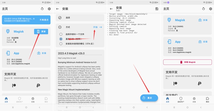 的安装都是不完整的;需要在开机后通过 Magisk 应用进行后续的重新安装。