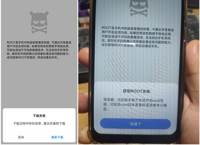 发版内测账号,哪怕你的手机已经解锁了BL,均出现开启ROOT失败,或者无法下载root包