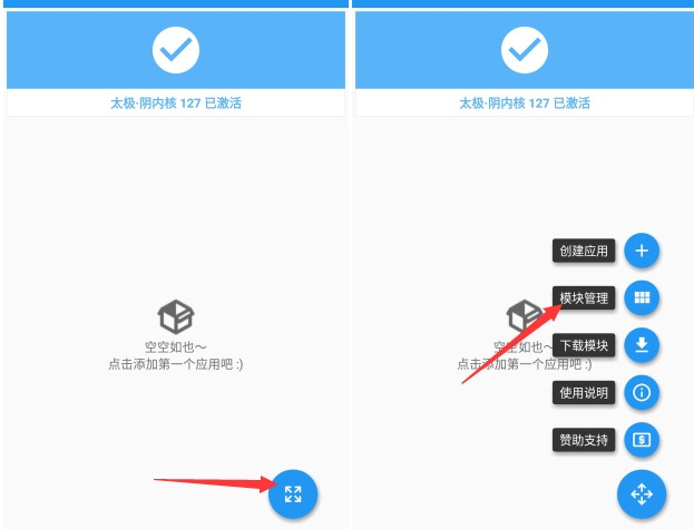 重启下手机,重启完成后,直接打开桌面上的太极APP软件点击右下角,选择模块管理