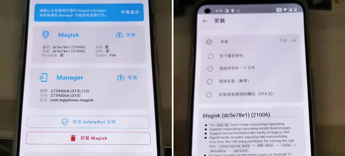 目前安卓11平台最稳妥的刷机root方法,推荐使用最新版本面具,旧版本面具将不再支持