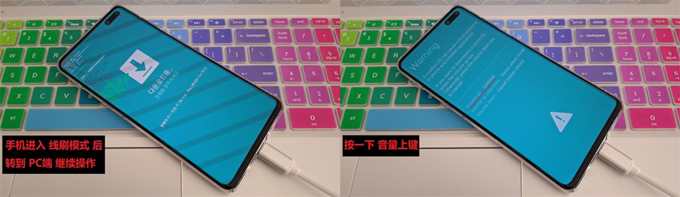 手机进入刷机模式,进入后,松开全部按键;再按1下音量下,进入线刷模式