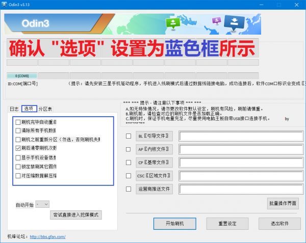 2:电脑驱动安装ok,解压odin工具并打开,点击odin工具的选项,如下图设置