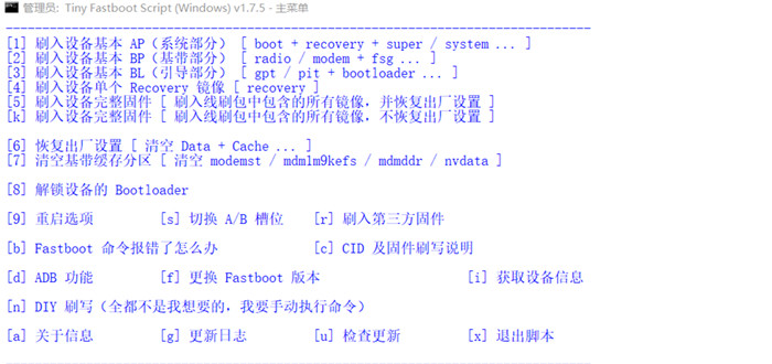 已更新到V1.75版本,可刷机救砖操作。首次使用本脚本将强制要求选mfastboot版本
