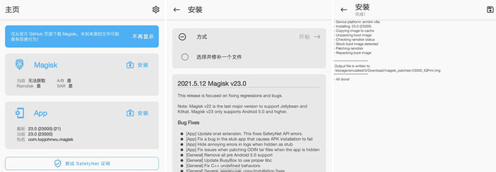 的系统一致的官方包,解压得到boot.img.使用Magisk V23.0稳定版对官方boot进行维补