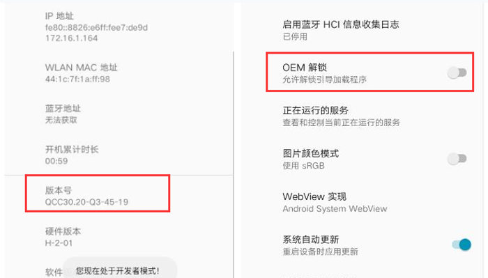 找到开发者选项进入,再在开发者选项里,我们直接打开USB调试+oem解锁两个按钮。如